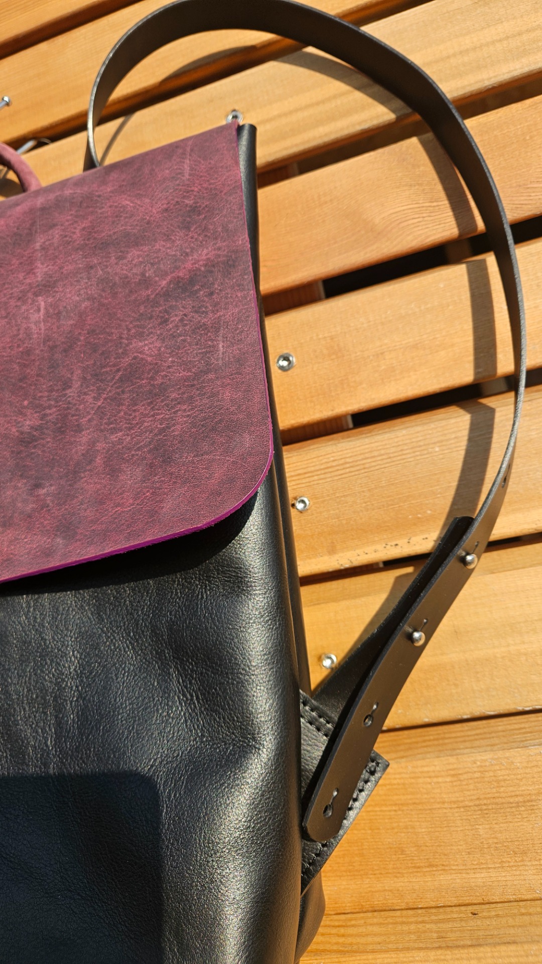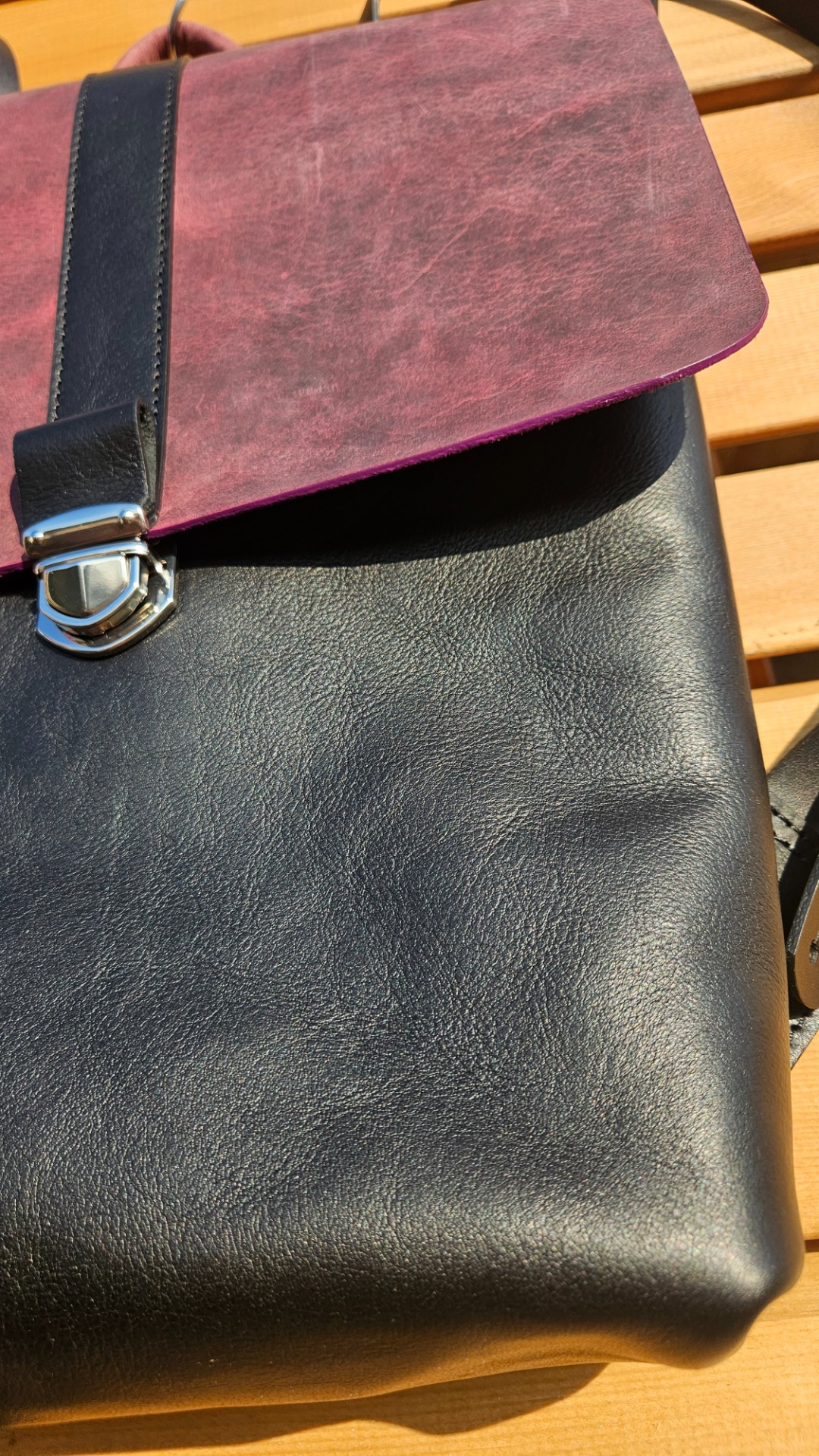 Klopa batohu ze z provoskované usně, mění efekty tmavý/světlý odstín.