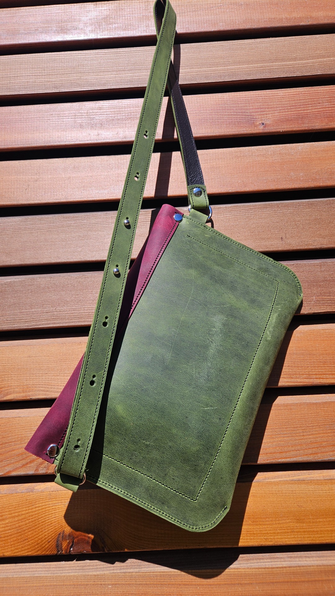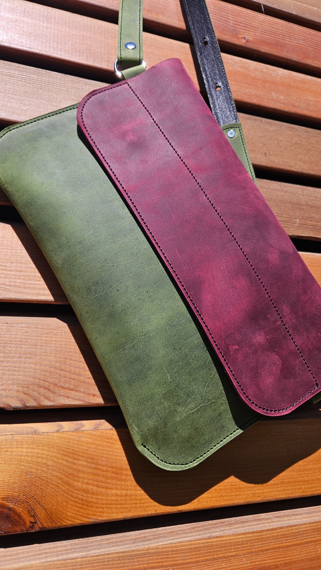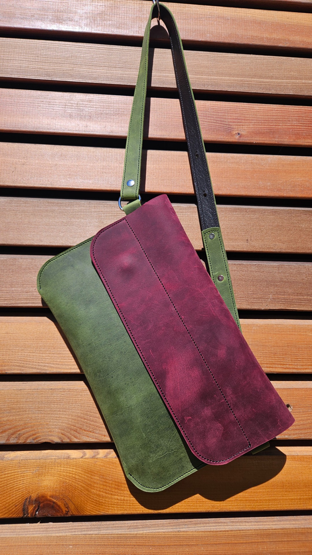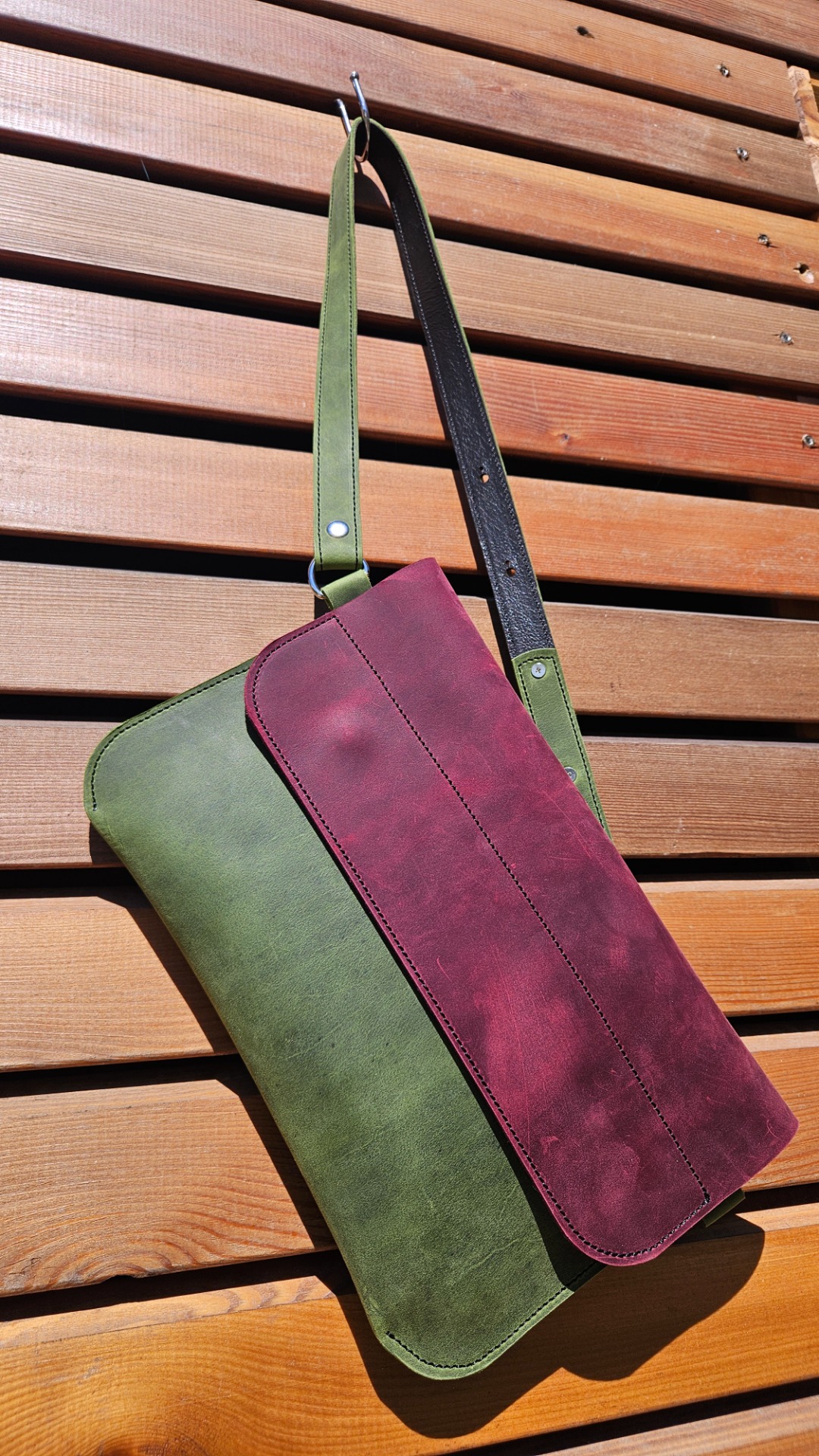 Kožená kabelka, voskovaná italská kůže, mění odstín světlý/tmavý při promnutí.