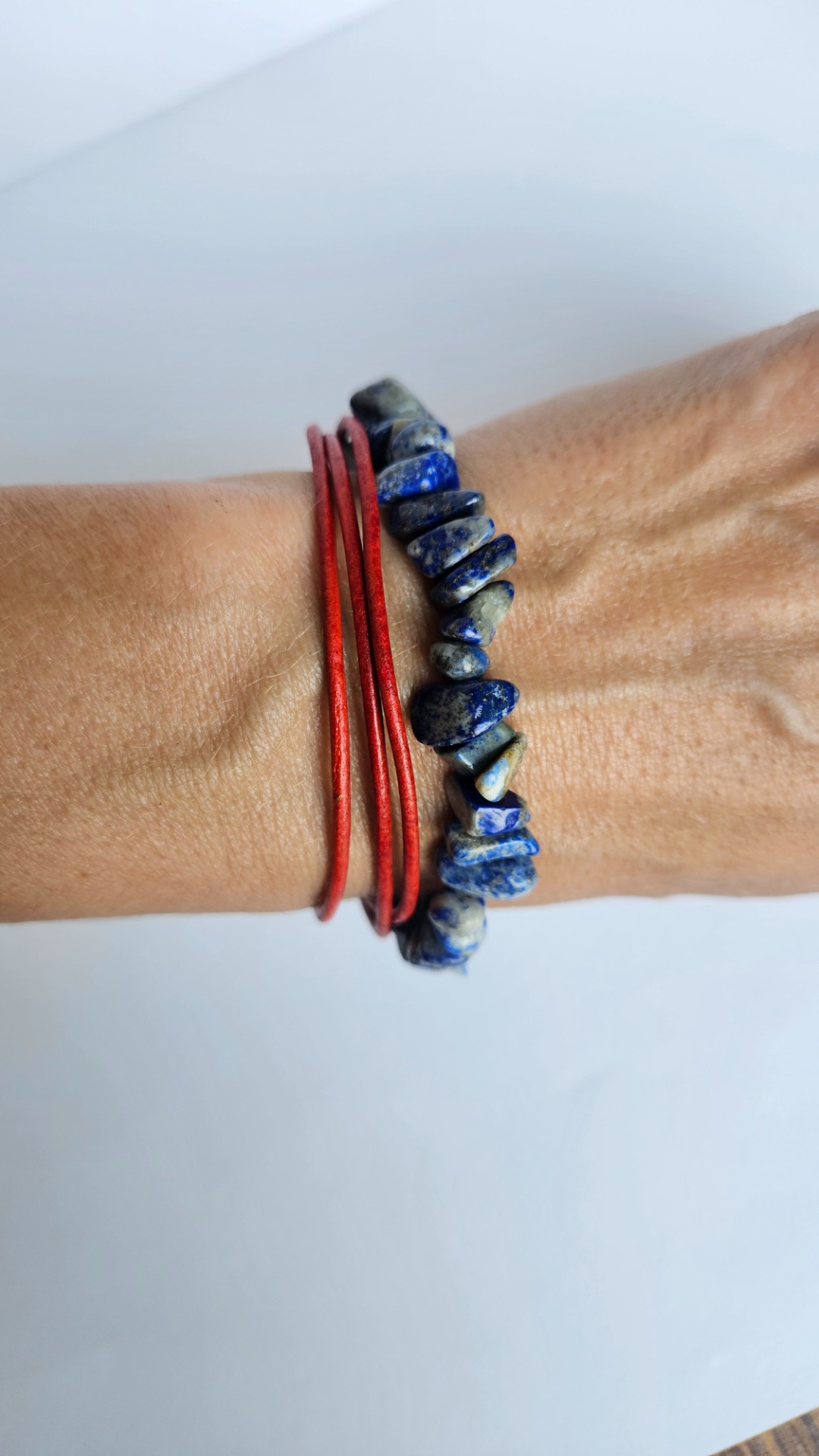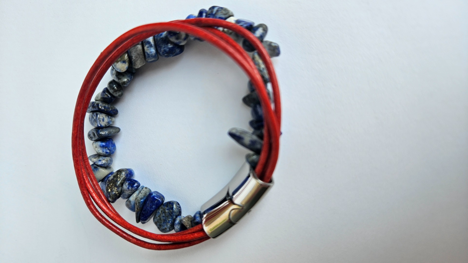 Kožený náramek, kůže červená + sodalit zlomky, stříbrné zapínání.