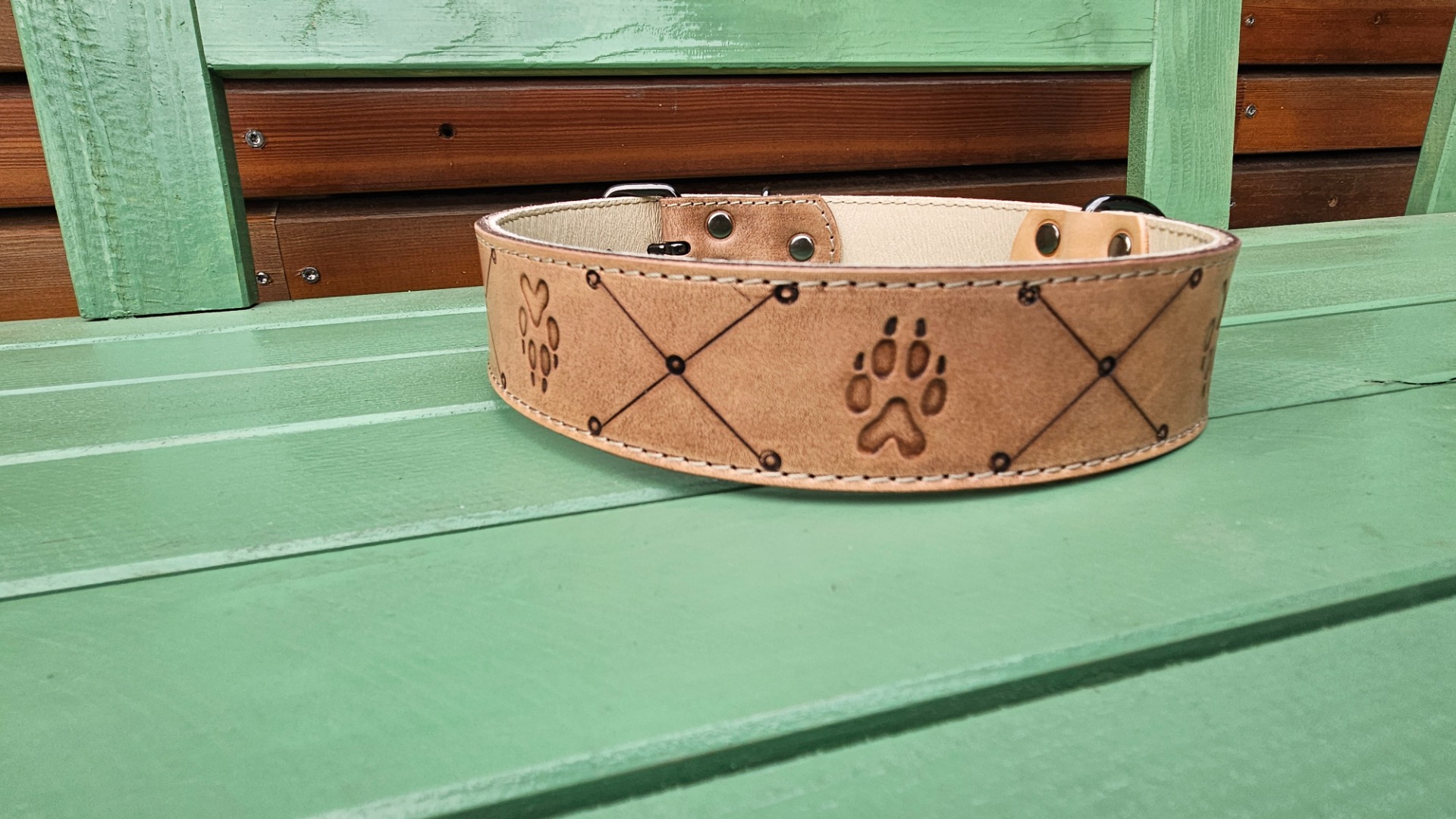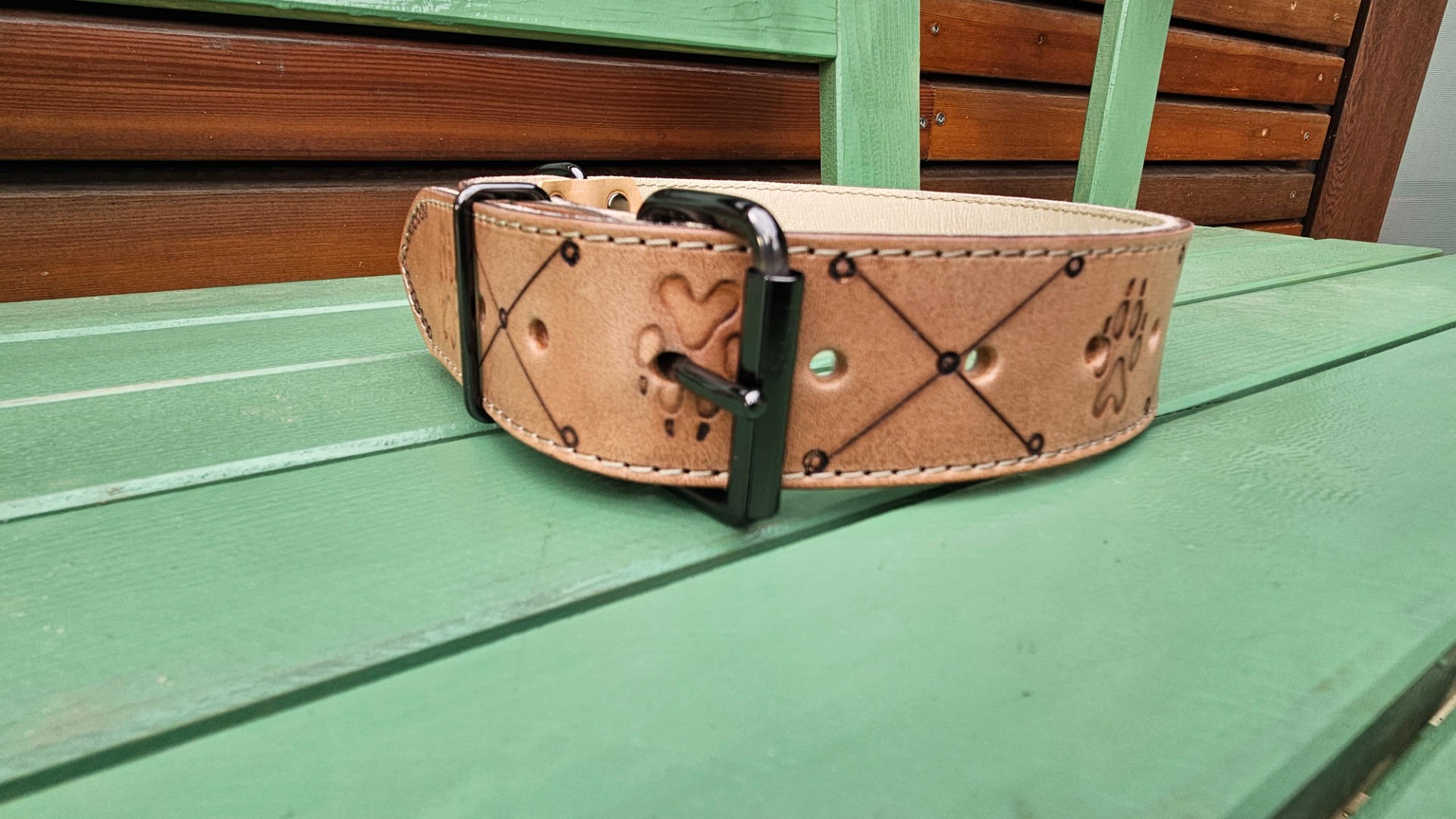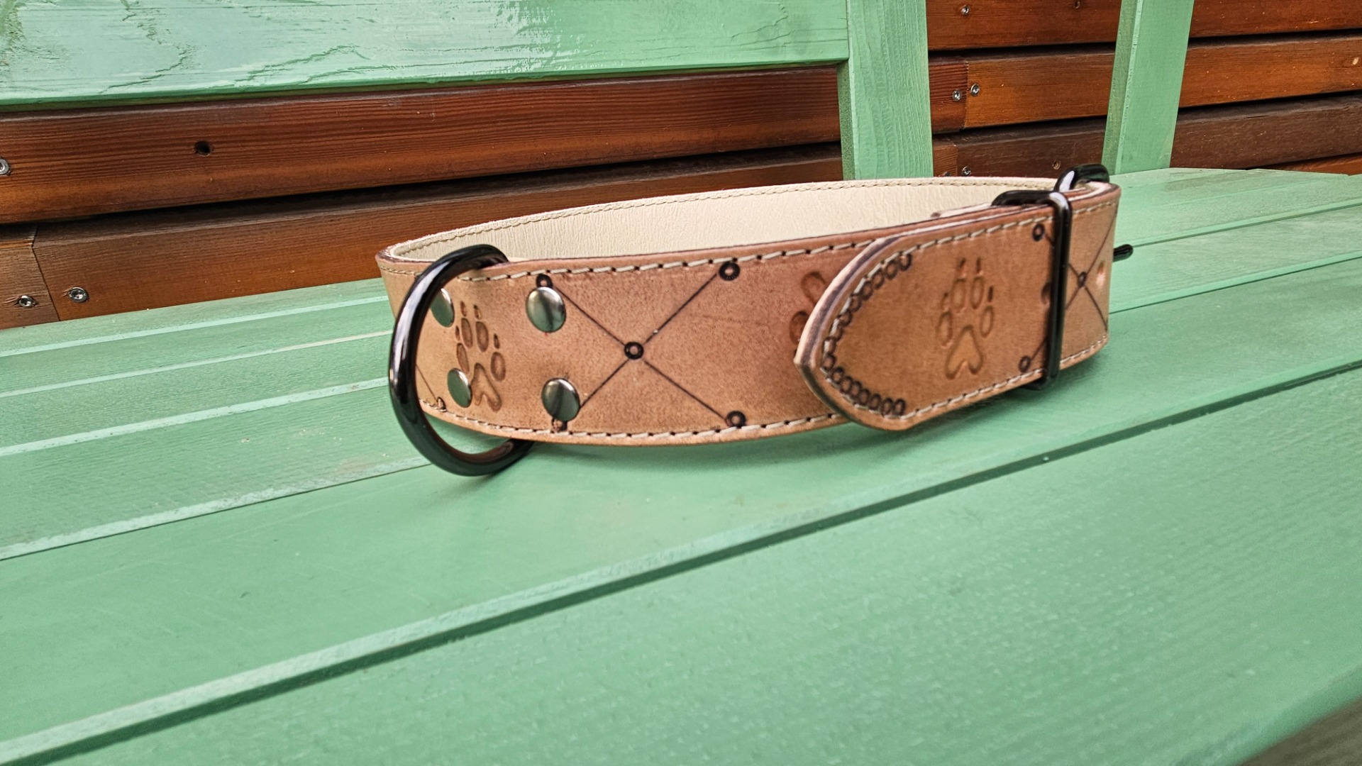 Obojek z 4mm hověziny, podšitý lícovou vepřovicí, velmi bytelný obojek š. 4cm, délka nastavitelná 50-65cm.