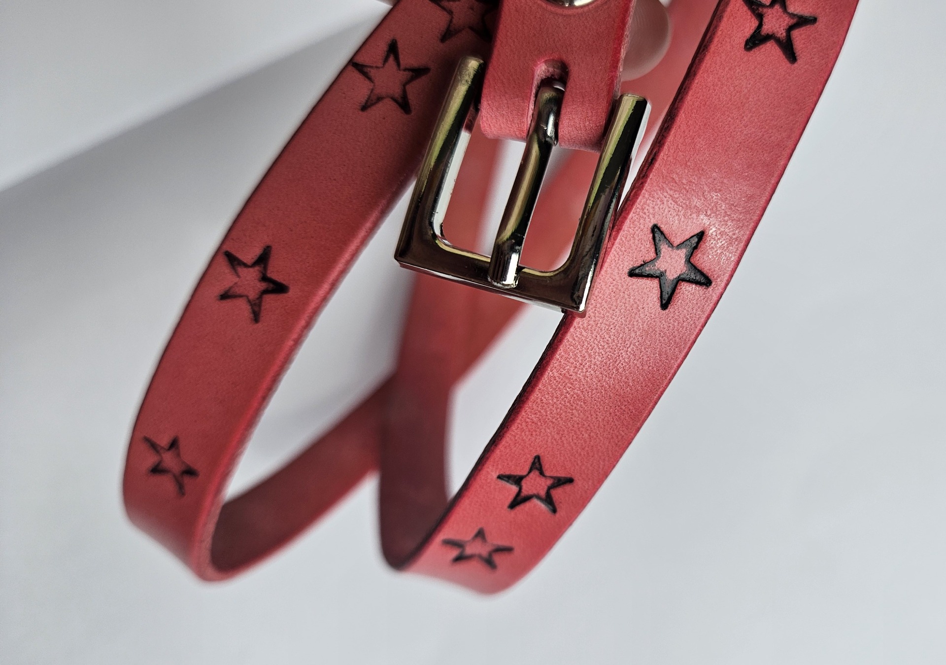 Kožený pásek Star je idealní pro oživení letních šatů. 5 dírek pro pohodlné nastavení, posuvné kožené poutko.