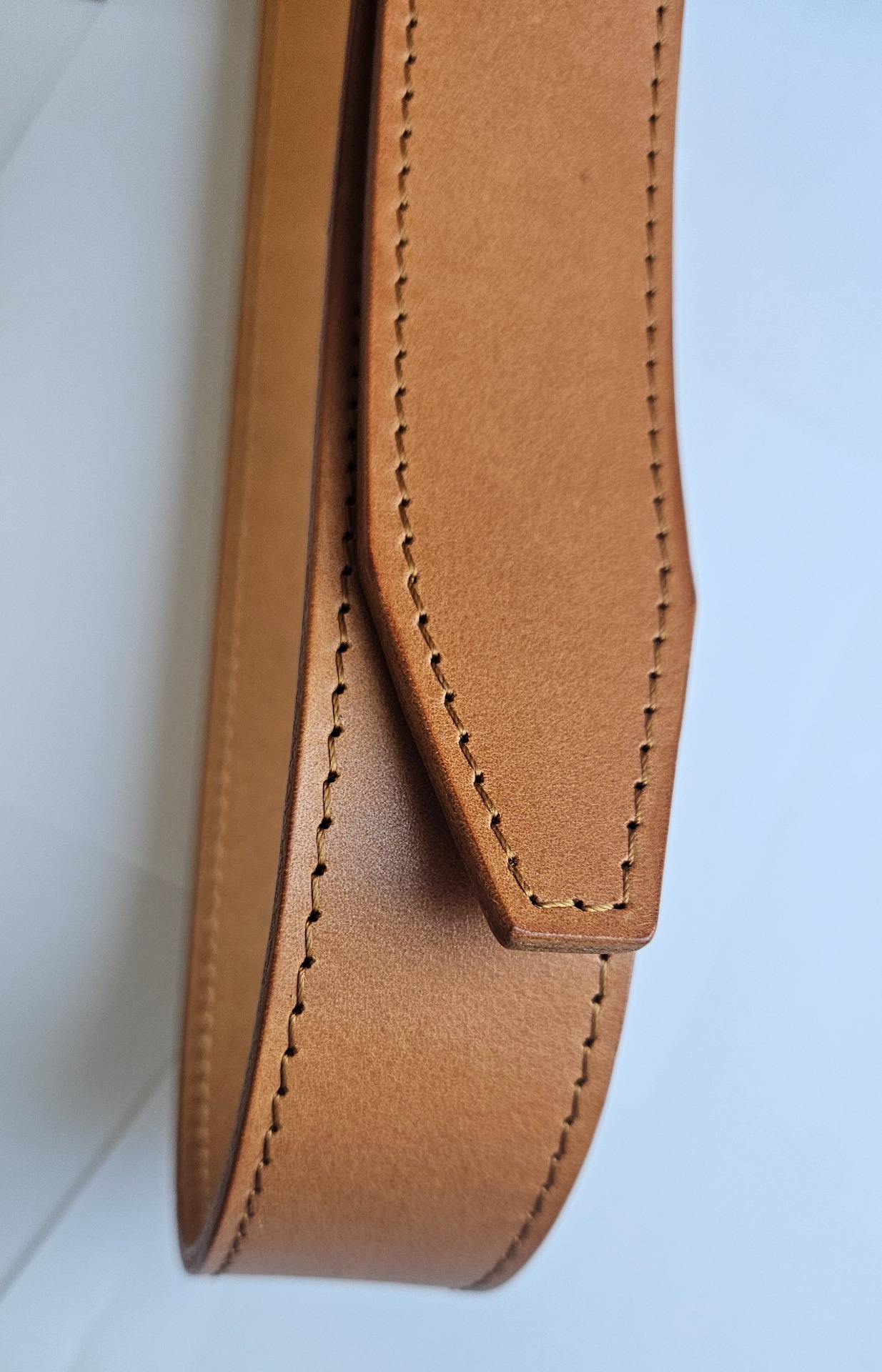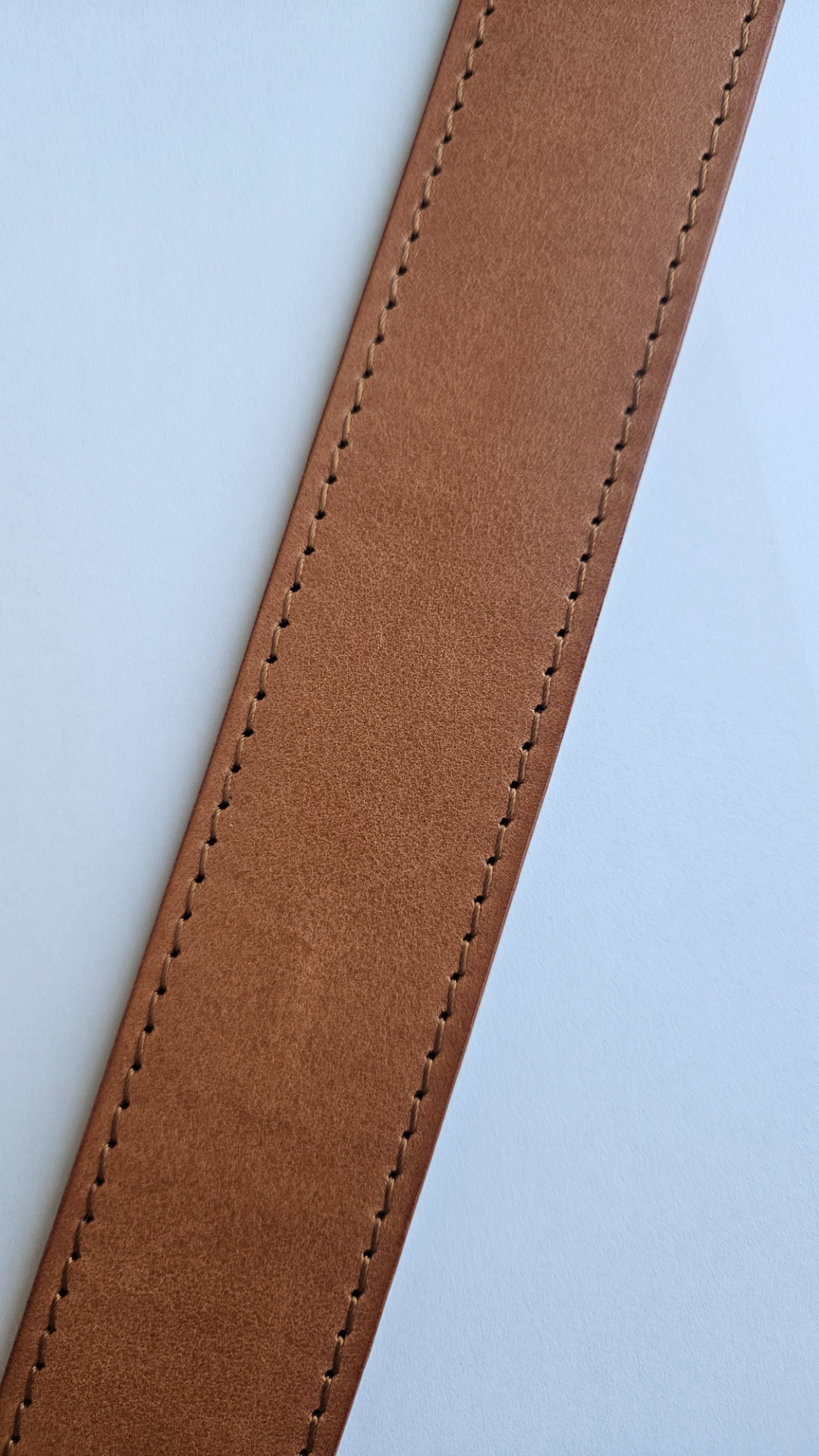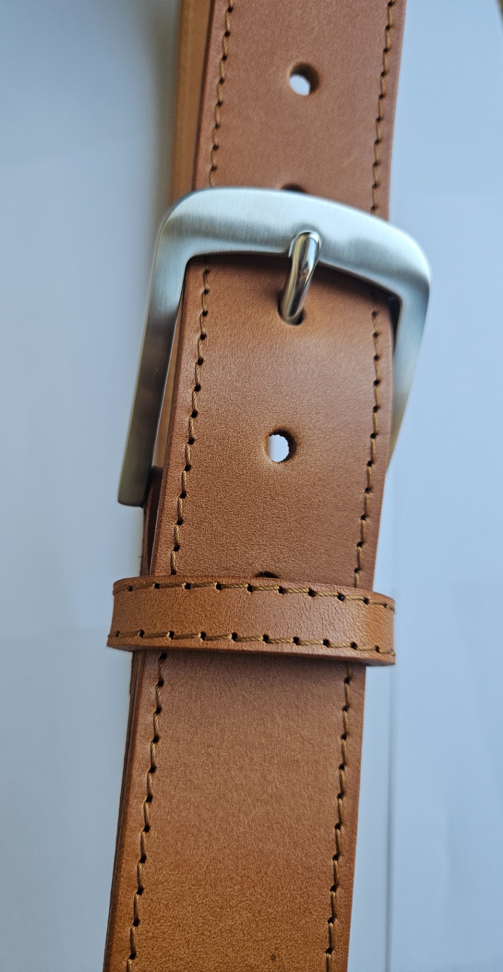 Ručně vyráběný opasek, 5 dírek na pohodlné zapínání. Opasek je vyroben z hovězí kůže "calvados", prémiová useň lehce válcovaná, která si ponechává tímto své skvělé vlastnosti. Pevnost a dlouhověkost jsou hlavní přednosti tohoto opasku.